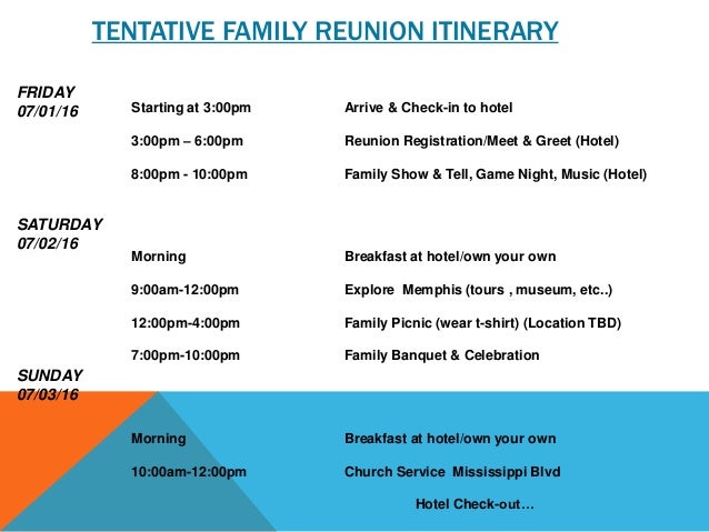 Image result family reunion itinerary template invitations registration planning. Free family reunion itinerary template picture. A typical family reunion will assemble for a meal, some recreation and discussion. Family reunion agenda template inspirational printable program invitations planning. Download printable family reunion flyers invitations keepsake memory book, history booklet, poems greeting cards letters banners tshirts ironons download all the family reunion printables,clipart and templates displayed on this page. Creating a family reunion itinerary will enable all of your family members to plan other activities outside of the scheduled reunion activities. This is particularly a great idea when planning a family reunion in a location which contains many tourist attractions. Now you can build the list of priorities and for later. You can add your own clues to the list too. You have refugee status, 5 years' humanitarian protection or settlement on protection grounds but do not yet have british citizenship. Family reunion itineraries could be an important document to make in order to prepare the travelling with the beloved family. The family itinerary template uses charts to track different aspects of your trip, from blood types to transportation plans. They are unfamiliar to us, which can make it hard to.